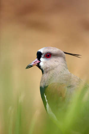 The southern lapwing (Vanellus chilensis), portait among greens. Portrait of lapwing from America with brown background.