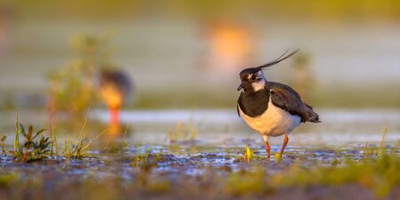 Northern lapwing (Vanellus vanellus) in wetland habitat other birds and wind blewn crest under warm colors of late evening sun.