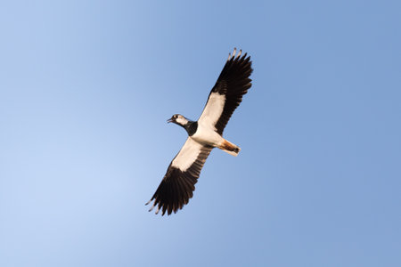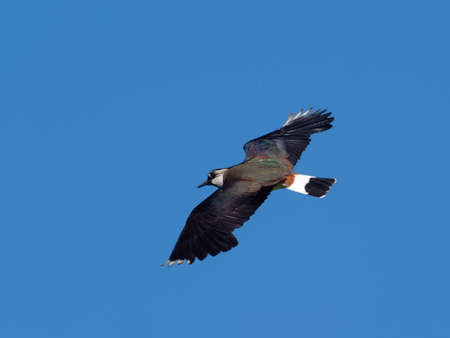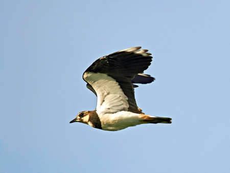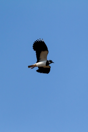 Northern Lapwing in flight with blue sky in the background