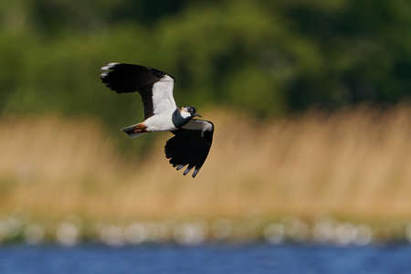 Close-up photo of a beautiful wader, starting from the lake's surface. Notrhen Lapwing, Vanellus vanellus.