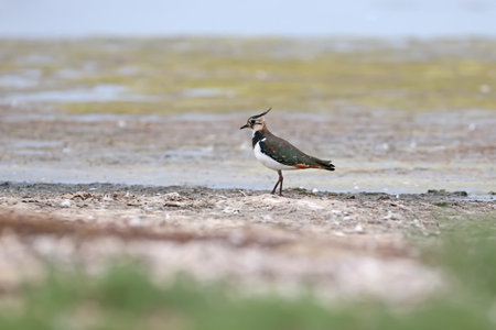 A lone northern lapwing (Vanellus vanellus) in winter plumage stands on the sandy shore of the estuary. close-up photo