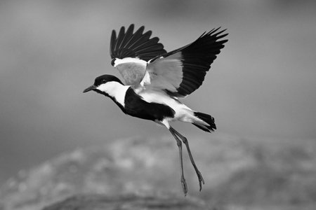 Mono spur-winged lapwing takes off over rock
