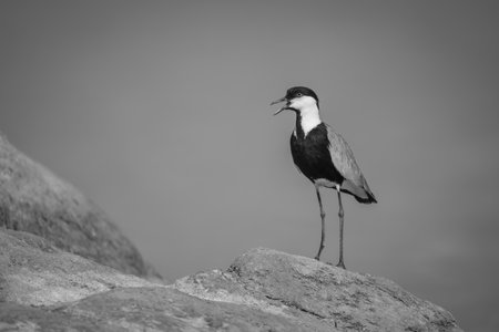 Mono spur-winged lapwing opens beak on rock
