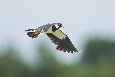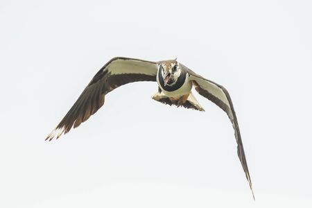 Northern Lapwing (Vanellus vanellus) Guarding its territory in grassland Breeding Habitat. This Plover has spectaculair Song Flight and Display Behaviour. Wildlife Scene of Nature in Europe with Bright Background.