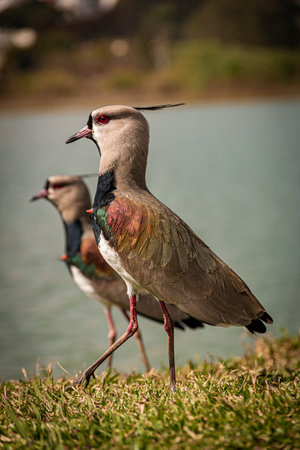 A closeup of Southern lapwing birds in the field by the lake