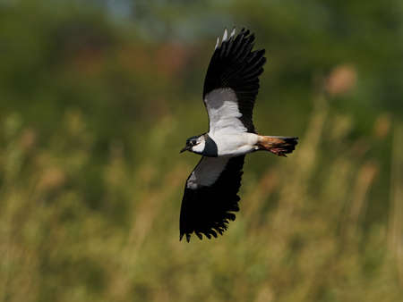 Northern Lapwing (Vanellus vanellus) Guarding its territory in grassland Breeding Habitat. This Plover has spectaculair Song Flight and Display Behaviour. Wildlife Scene of Nature in Europe with Bright Background.