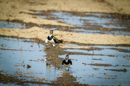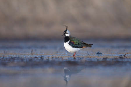 Northern lapwing (Vanellus vanellus) searching for food in the wetlands in summer.