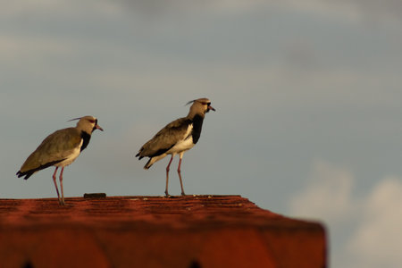 Two black and white northern lapwing birds flying close to each other on a partially blue sky. It is also known as the green plover, tuit or tew-it, peewit or pewit, vanellus vanellus or pyewipe.