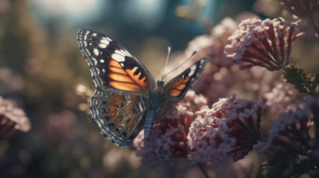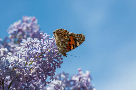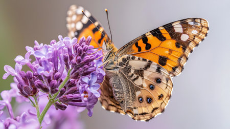 Vibrant butterfly perched on lilac bloom, showcasing nature's beauty and delicate floral interaction, perfect for promoting springtime tranquility and garden aesthetics. Spring flowers.