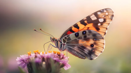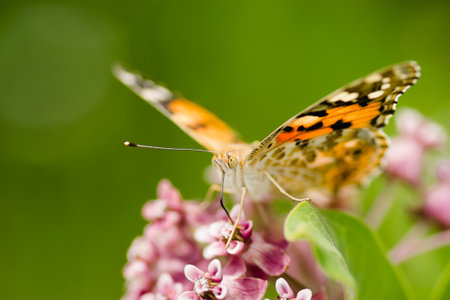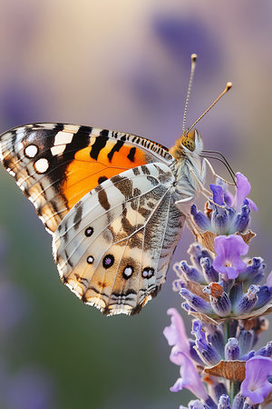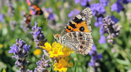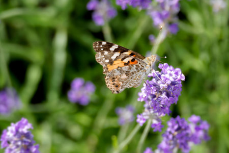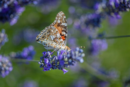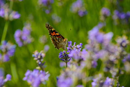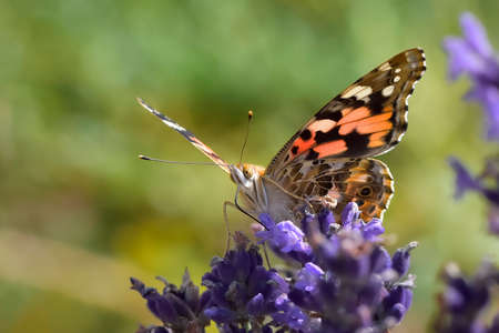 Butterfly drawing nectar from lavender flower, colorful painted lady (Vanessa cardui), shallow depth of field macro photography