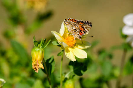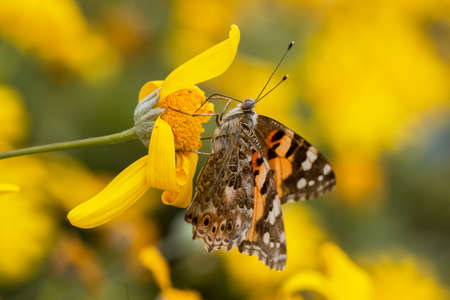 Butterfly Vanessa cardui sitting on a flower of yellow wild chrysanthemum during migration from Africa to Europe through Israel