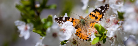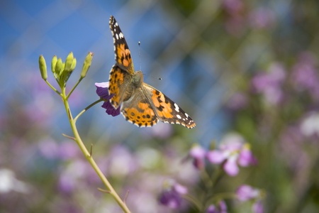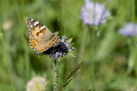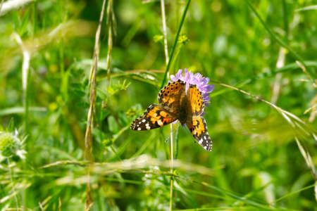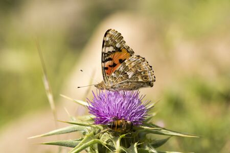 Thistle butterfly, also called painted lady, pollinating a flower