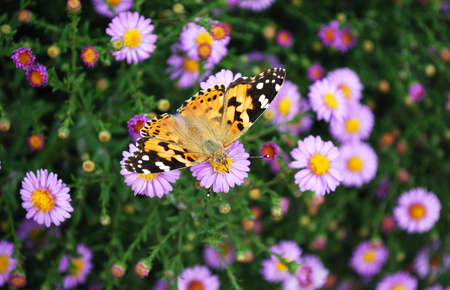 Butterfly Vanessa is orange on a purple lavender flower in the sunlight. Macrophotography of wildlife. The butterfly pollinates flowers in the garden. Bright summer colorful background. Top view