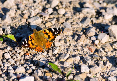 beautiful live butterfly sits on a stone road from gravel in the evening sun