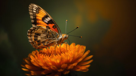 Close-up view of a butterfly perched delicately on a vibrant flower petal, showing intricate patterns and textures.