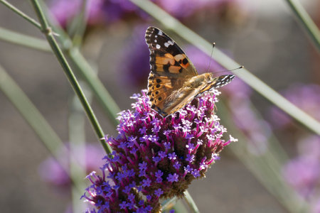 Painted Lady (Vanessa Cardui) Butterfly perched on purple flower in Zurich, Switzerland