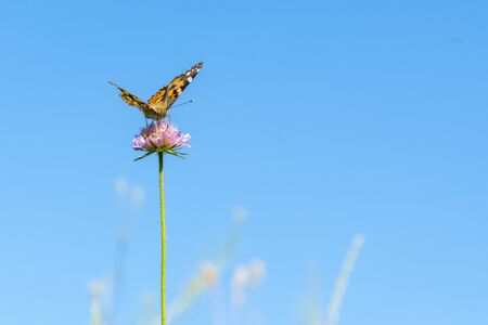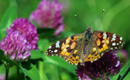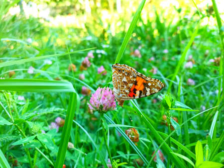 colorful butterfly painted lady on clover flower in the meadow. close up. selective focus