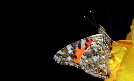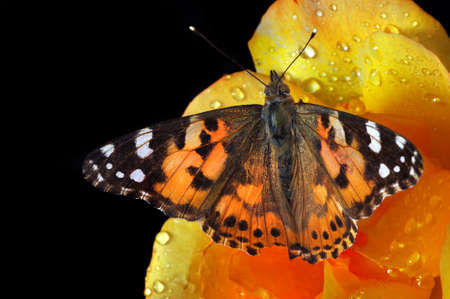 colorful butterfly on yellow rose petals in dew drops isolated on black. painted lady butterfly