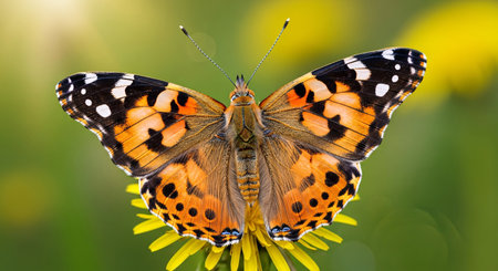 Close-up of a vibrant Painted Lady butterfly (Vanessa cardui) with open wings, resting on a bright yellow flower against a soft green bokeh background, showcasing its intricate patterns.