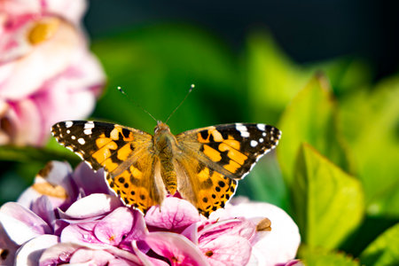 Painted Lady (Vanessa Cardui) Butterfly perched on pink flower in Zurich, Switzerland