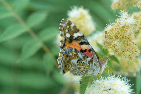 Beautiful painted lady (Vanessa cardui) pollinating at bright valerian flowers