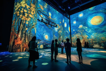 A person lies on the reflective floor of an immersive art gallery, completely surrounded by projections of Vincent van Gogh's iconic painting, 'The Starry Night.' The swirling blues and yellows of the masterpiece cover the walls and ceiling, creating a breathtaking and dreamlike experience. The scene captures a modern way of interacting with and experiencing classic art.