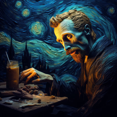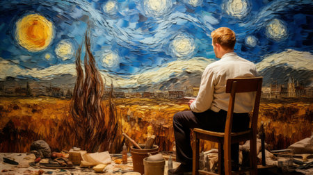 a man sits at a table amidst a starry sky in the style of sculpted impressionism and action painting. the artwork showcases dark cyan and beige hues, reminiscent of vincent van gogh's masterpieces. created by the talented artist sam spratt, this piece captivates with its highly detailed figures and realistic color schemes. ai generated