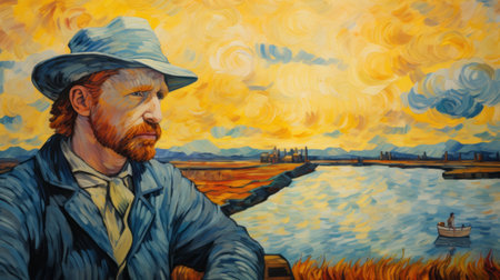van gogh sitting in the painting memories of brabant, capturing his essence and passion for art. this artwork immerses viewers in the vibrant colors and expressive brushstrokes synonymous with the artist. the scene evokes nostalgia for brabant's landscapes, blending history and creativity in a timeless masterpiece. ai generated