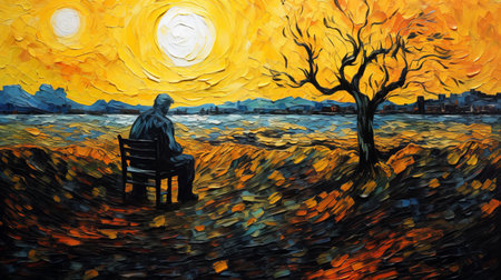 a man sits on a bench, surrounded by a burning tree, in this expressive oil painting. the style draws inspiration from vincent van gogh's color fields and romantic moonlit seascapes, showcasing a golden light. the emotional expressionism is evident in the detailed art, with dark yellow and dark cyan hues adding depth to the composition. ai generated