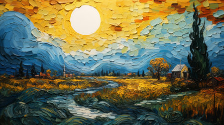 an original painting featuring a landscape with the sun shining from behind, created in the style of thick impasto texture. the artwork showcases vibrant hues of yellow and azure, reminiscent of the works by patrick brown and qian xuan. the painting incorporates musical color fields and is presented on a shaped canvas, highlighting the artist's skilled use of the impasto technique. ai generated