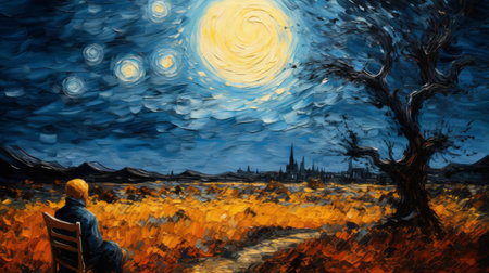 a woman sits in front of a field under a starry night sky in this palette knife impressionism painting. the dark yellow and blue hues create haunting landscapes and dazzling cityscapes. the high-resolution artwork captures the beauty of romantic moonlit seascapes and swirling vortexes. ai generated