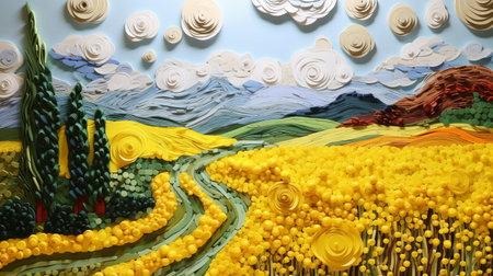 a paper piece featuring a surreal 3d landscape with white wheat fields, yellow flowers, and vibrant color fields. this artwork showcases the artist's skill in creating atmospheric clouds, romantic riverscapes, and ultrafine details. the colorful woodcarvings and large-scale installations add depth and visual interest to the composition. ai generated