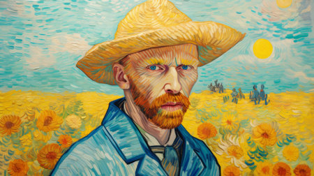 a photo of a powerful and emotive portrait in the style of bay area figurative art by vincent van gogh. the realistic blue skies and vibrant colors of light orange and blue create a cinematic view. this 8k image captures the essence of rural life scenes, showcasing van gogh's talent as a master artist. ai generated