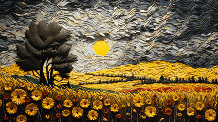 a field of vibrant yellow sunflowers fills the night, resembling intricate paper sculptures. the textured impasto landscapes create a visually captivating scene, complemented by richly colored skies. the artistic influences of george callaghan and philippe druillet are evident in the precisionist lines and the vibrant, colorful woodcarvings. ai generated