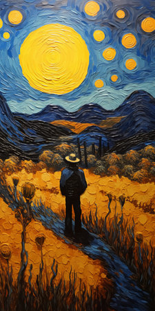 a man stands in a field, gazing up at a starry night. this painting, inspired by desertpunk and vincent van gogh, showcases the vibrant colors of dark turquoise and dark yellow. the artist, ephraim moses lilien, skillfully employs impasto techniques and incorporates elements of colorful woodcarvings. this landscape painting captures the viewer's attention with its mesmerizing beauty and dreamlike atmosphere. ai generated