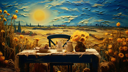 vincent van gogh sits contemplatively in a rustic chair, surrounded by the rolling hills and countryside of brabant, netherlands, in this evocative painting, capturing the post-impressionist master's nostalgic memories of his childhood home, where he drew inspiration from the region's picturesque landscapes and rustic charm. ai generated
