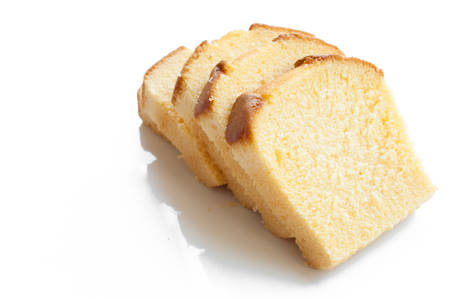 Sliced sponge dessert. Sweet sponge cake isolated on white background.