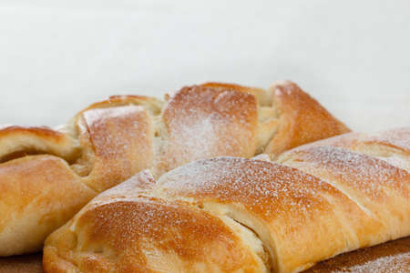 Ruddy roll is strewed by powdered sugar with a stuffing from apple jam