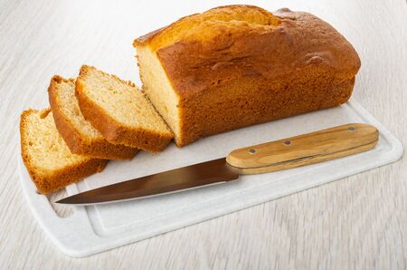 Pieces of muffin, kitchen knife on plastic cutting board on wooden table