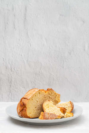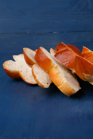 Sweet bread, easter tsoureki cozonac sliced on wood table background, closeup view. Braided brioche, festive traditional challah