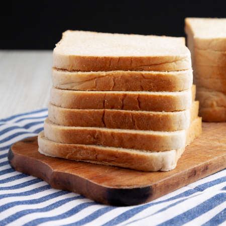 Slices of White Bread on a Rustic Wooden Board, side view.
