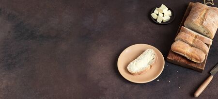 Bread and Butter, copy space, banner. Fresh ciabatta bread and organic butter for breakfast.