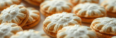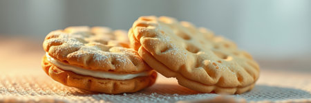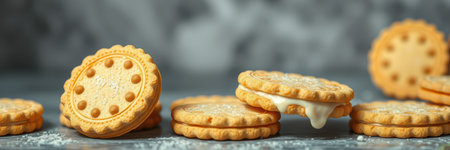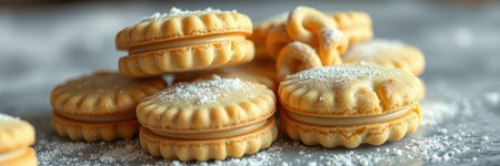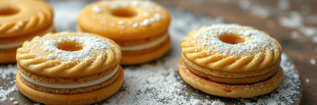 Delicious cream-filled cookies arranged on a countertop with a soft focus background and powdered sugar sprinkle