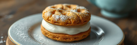 Dessert sandwich with cream filling and powdered sugar on a plate, served in a cozy setting