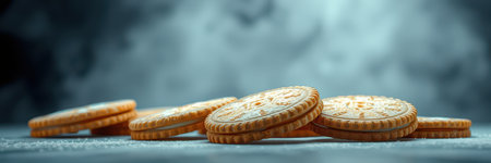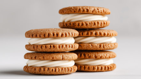 Stacked cookies with cream filling arranged on a warm toned background in an appetizing display for dessert lovers