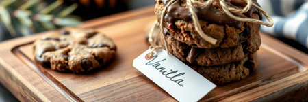 Delicious homemade vanilla cookies stacked on a wooden board with a small label