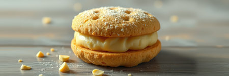 Delicious dessert featuring a creamy filling sandwiched between two golden cookies on a wooden surface