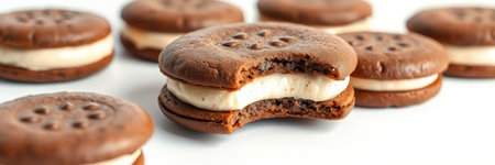 Delicious chocolate sandwich cookies with cream filling on a white surface creating an inviting dessert display
