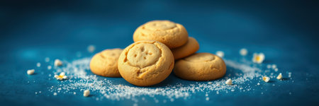 Delicious cookies arranged on a blue background with one cookie bitten, highlighting their texture and design