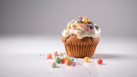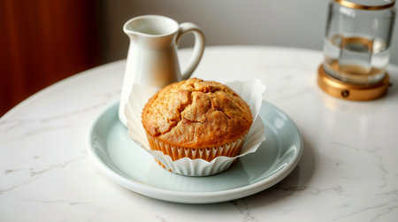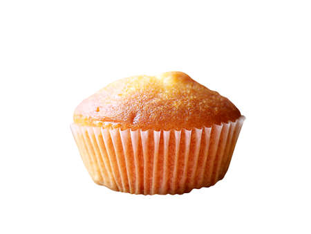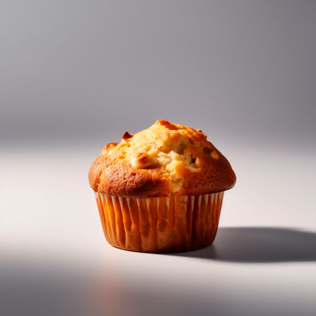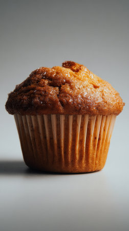 Golden muffin displayed on a neutral background highlighting its texture and bakery appeal muffin dessert closeup simple browned appetizing single cupcake. Generated A.I.